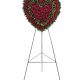 - A standing wreath of stunning flowers such as hot pink roses and carnations, red roses, burgundy dahlias, dark pink Sweet William, lavender chrysanthemums and fresh greens.