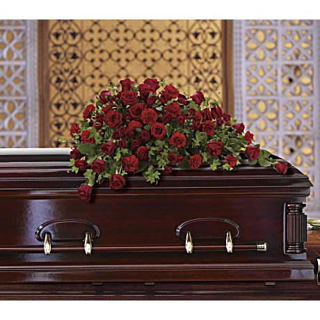 - Rich red roses and carnations are combined with salal and green ivy into a dramatic casket spray.