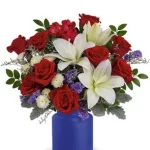 Sparkling like an Independence Day fireworks display, a striking red, white and blue spray stands tall, proud and patriotic. Bearing the colors of our nation’s flag, it’s a grand and fitting tribute to members of the military and American heroes. The spray measures approximately 42″ x 27″.
