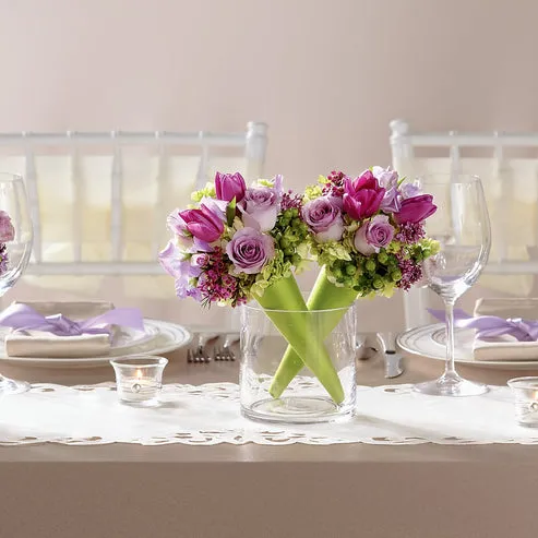 A vision of modern grace and refined elegance, the Sublime Centerpiece brings a fresh, contemporary touch to your wedding décor. Two clear glass cylinder vases are placed side-by-side, each holding a pair of diagonally arranged bouquets for a dynamic and sweet presentation. Each bouquet features a harmonious blend of lavender sweet pea, purple tulips, lavender spray roses, green mini hydrangeas, purple lilacs, waxflower, green hypericum berries, and lush greens—all gathered in vibrant green bouquet cones. This artful design delivers a sophisticated, garden-fresh aesthetic perfect for today’s modern celebration.