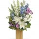This soft, sweet arrangement of peach roses and yellow spray roses is a lovely tribute to a beautiful life.